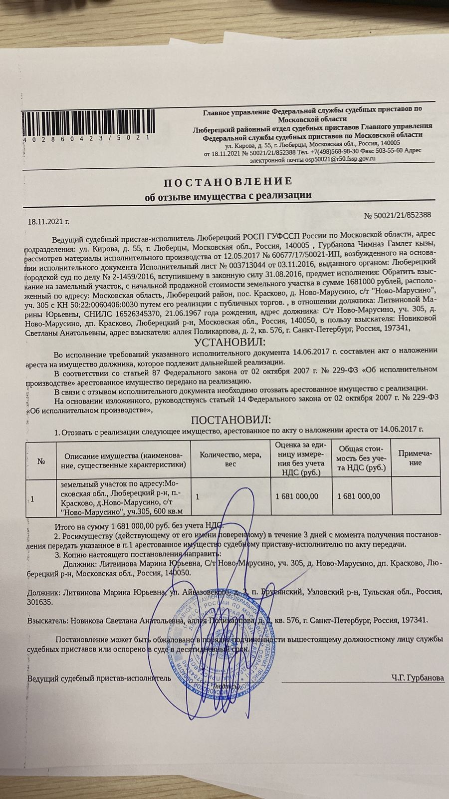 Земельный участок, общ.пл. 600 кв.м, к/н: 50:22:0060406:30, адрес: МО, Люберецкий район, д.п. Красково, д. Марусино, СНТ "Ново-Марусино", уч. 305. П. 35-З. Собств: Литвинова М.Ю.